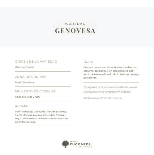 Proveniente de Valencia, España, sus aceites destacan por la complejidad de frutado en armonía con amargos y picantes de intensidad media. Se trata de una variedad de gran adaptación que, debido a su maduración temprana en nuestra región, puede dar perfiles con marcadas diferencias, dependiendo del momento en que sea cosechada.