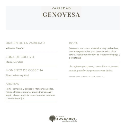 Proveniente de Valencia, España, sus aceites destacan por la complejidad de frutado en armonía con amargos y picantes de intensidad media. Se trata de una variedad de gran adaptación que, debido a su maduración temprana en nuestra región, puede dar perfiles con marcadas diferencias, dependiendo del momento en que sea cosechada.