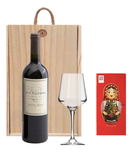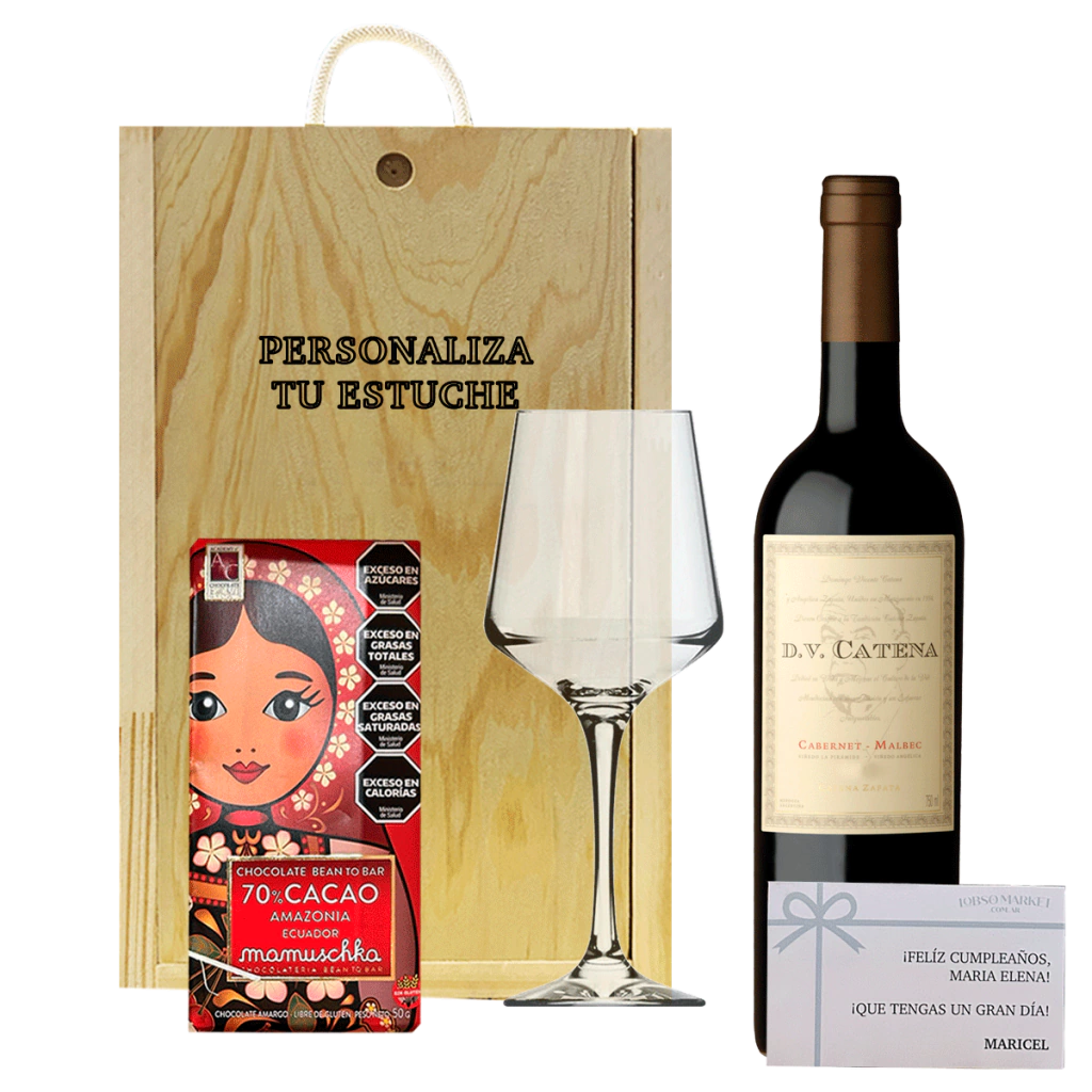 Eleva tus regalos con esta cuidada selección que incluye el prestigioso Vino Tinto DV Catena Cabernet Malbec, una copa de vino tinto y los deliciosos bombones Mamuschka. Todo presentado en una hermosa caja de madera que puedes personalizar eligiendo entre nuestras opciones de grabado. Este regalo se entrega listo para sorprender en una bolsa de friselina de alta calidad.