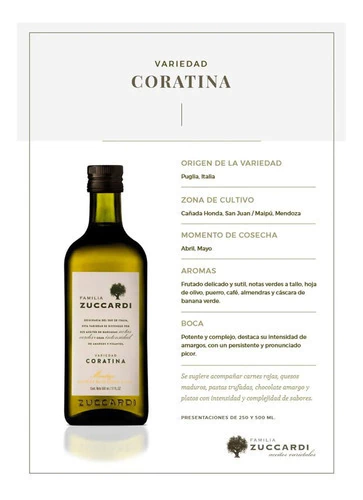 Originaria de la región de Puglia al sur de Italia, se distingue por sus aceites de marcadas notas verdes y alta intensidad de amargos y picantes. Variedad muy apreciada por su perfil herbáceo con notas especiadas y muy rica en polifenoles, lo que le otorga su carácter e intensidad.