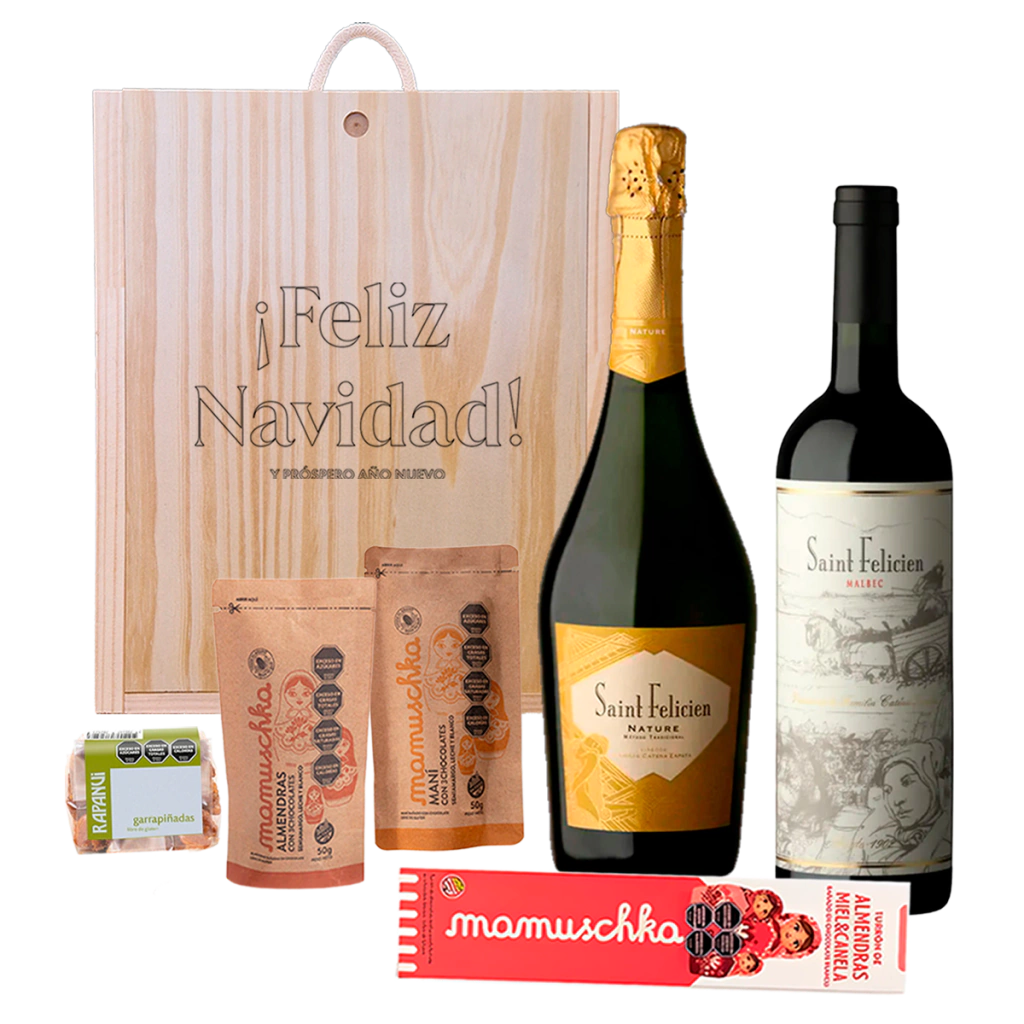 Sorprendé estas Fiestas con un regalo exclusivo y elegante. Nuestro estuche de madera con grabado navideño incluye una selección de bebidas y delicias gourmet para compartir y celebrar: