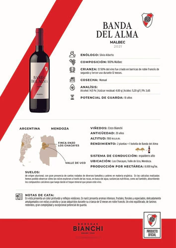 Un Malbec de alta gama que honra el espíritu de la camiseta más emblemática. Cada copa de este vino es un tributo al honor de llevar el escudo de River Plate en el corazón. Un vino excepcional que habla de la pasión, la grandeza y el espíritu indomable de los Millonarios.