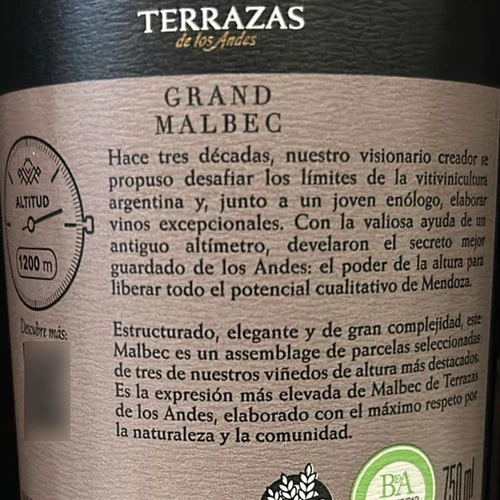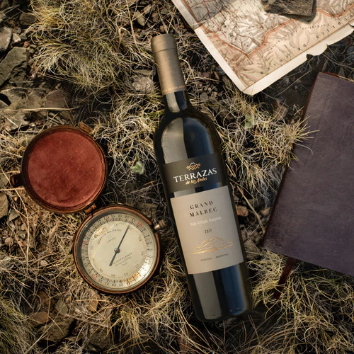 Terrazas de los Andes Grand Malbec es la combinación de un blend de tres de los viñedos de altura más excepcionales de Terrazas de los Andes: Las Compuertas (IG La Compuertas, a 1070 m.s.n.m), Los Castaños (IG Paraje Altamira, a 1100 m.s.n.m) y Licán (IG Los Chacayes, 1200 m.s.n.m). Esta diversidad de elevaciones y de suelos, otorga elegancia, amplitud, complejidad y una expresión plena de matices a la creación final.