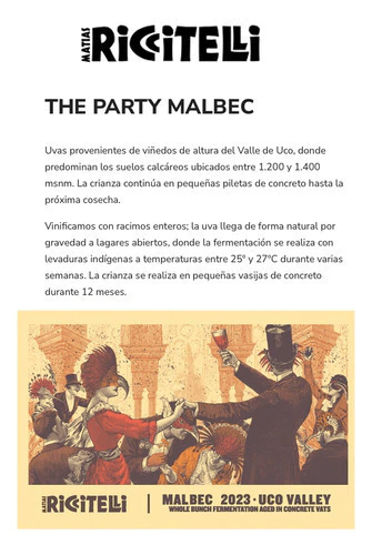 Uvas provenientes de viñedos de altura del Valle de Uco, donde predominan los suelos calcáreos ubicados entre 1.200 y 1.400 msnm. La crianza continúa en pequeñas piletas de concreto hasta la próxima cosecha.